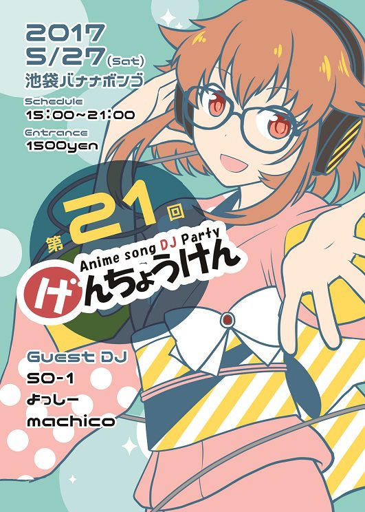 終了しました げんちょうけん第21回 申し訳ございません。こちらのイベントは終了しています。 バナナボンゴでは、 他にも楽しいイベントをたくさん開催しています!! 最新イベント情報 ”みんなが知ってるアンセムからコレクター好みのレアグルーヴまで” 池袋のヲタカルチャーを牽引するイベント、げんちょうけん! 今回も素敵なゲストをお迎えして、お酒片手にアニソン三昧! イベントについて 開催日時 5月27(土)15:00~21:00 入場料 1500円(+ワンドリンク制) ※Twipla参加表明orフライヤーの割引券で500円OFF!! ※コス割あり!!ドリンク1杯無料!! タイムテーブル DJ's 15:00~15:45 じーん 15:45~16:30 しーちきん 16:30~17:15 よっしー 17:15~18:00 いっちょ 18:00~18:45 machico 18:45~19:30 チェン 19:30~20:15 SO-1 20:15~21:00 びすとろ VJ's 15:00~ そうる 18:00~ カナタ 注意事項 ※20歳未満の飲酒・喫煙は固くお断りしております。 (20歳以上の方も飲み過ぎには注意しましょう) ※飲食物の持ち込み不可です。が差入れ大歓迎!アナウンスのうえみんなで山分けします! ※再入場可です。再入場される場合、店を出る時に必ず受付で再入場カードを受け取って下さい。 カードが無い場合は再入場できません。 ※コスプレをされる方は受付けでお伝えください。更衣室をご案内いたします。 ※貴重品の管理は、各自の責任でお願いします。盗難紛失等に関しましては一切の責任を負いかねます。 ※他の参加者への迷惑行為は禁止です。困ったときはお近くのスタッフ、出演者にお声かけください。 ホーム > 最新イベント情報 > げんちょうけん > げんちょうけん第21回